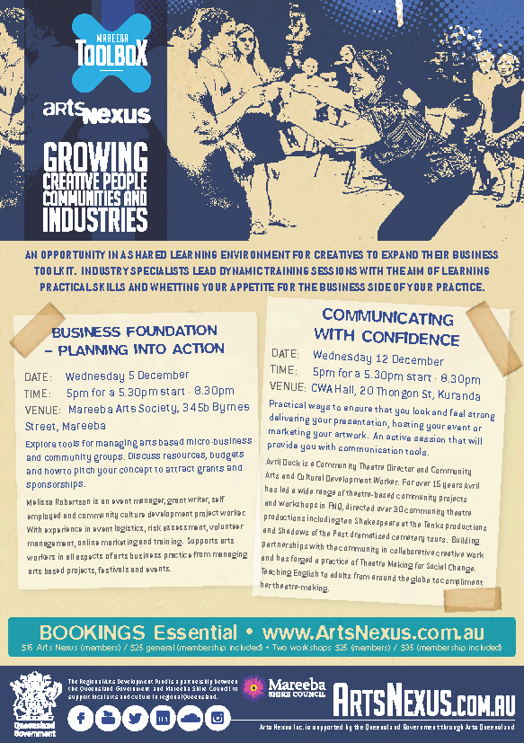 provide you with communication tools. Avril Duck is a Community Theatre Director and Community Arts and Cultural Development Worker. For over 15 years Avril has led a wide range of theatre-based community projects and workshops in FNQ, directed over 30 community theatre productions including ten Shakespeare at the Tanks productions and Shadows of the Past dramatised cemetery tours. Building partnerships with the community in collaborative creative work and has forged a practice of Theatre Making for Social Change. Teaching English to adults from around the globe to compliment her theatre-making.